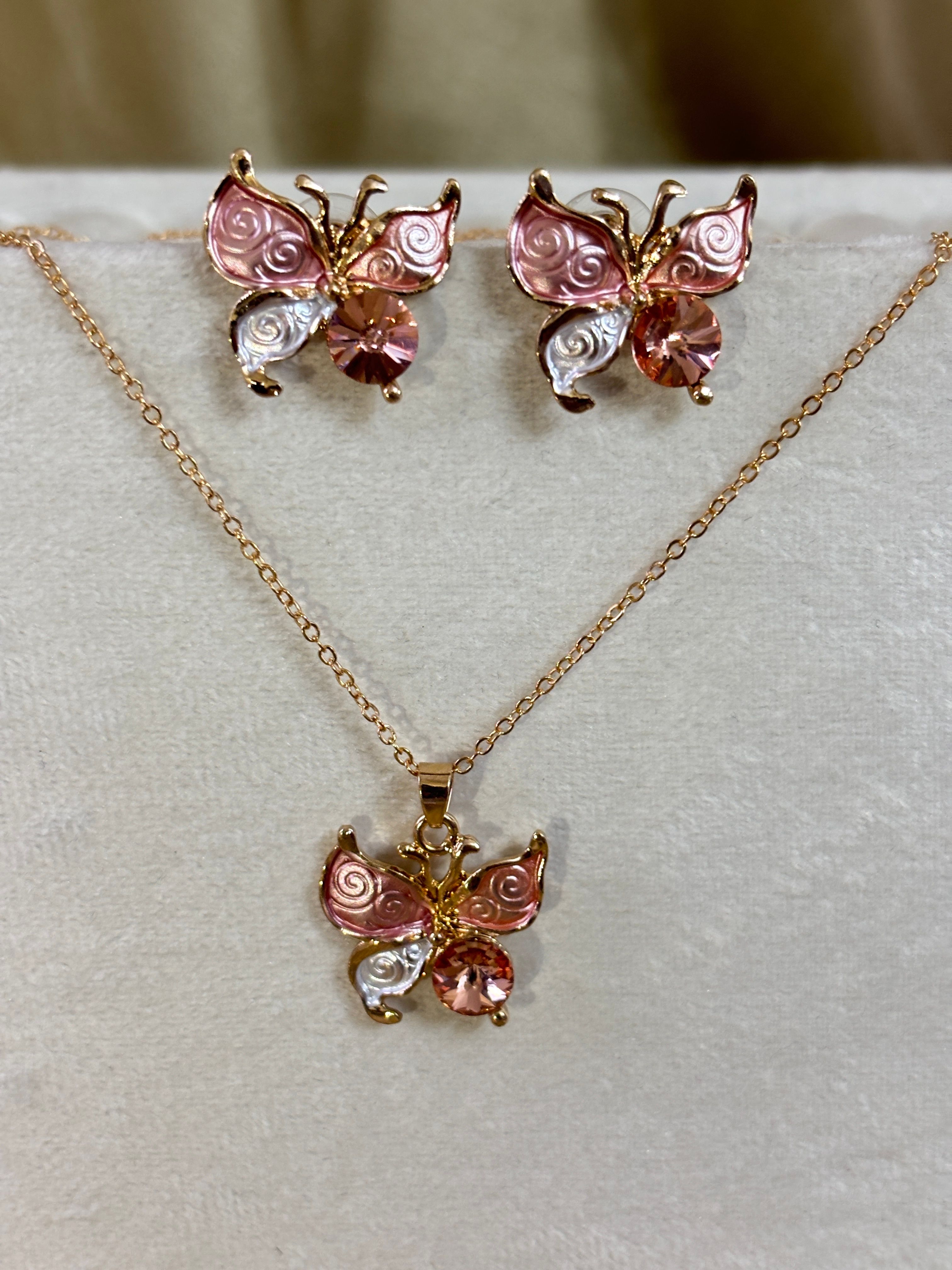 The Butterfly Stone Studded Set is a curated enamel and stone combo jewellery set featuring a butterfly motif with embedded stone detailing. Handcrafted in India with a nickel-free zinc alloy base, this artificial jewellery combo is perfect for gifting, festive styling, and everyday ethnic looks. Lightweight, skin-safe, and beautifully finished — a complete set that does the styling for you.