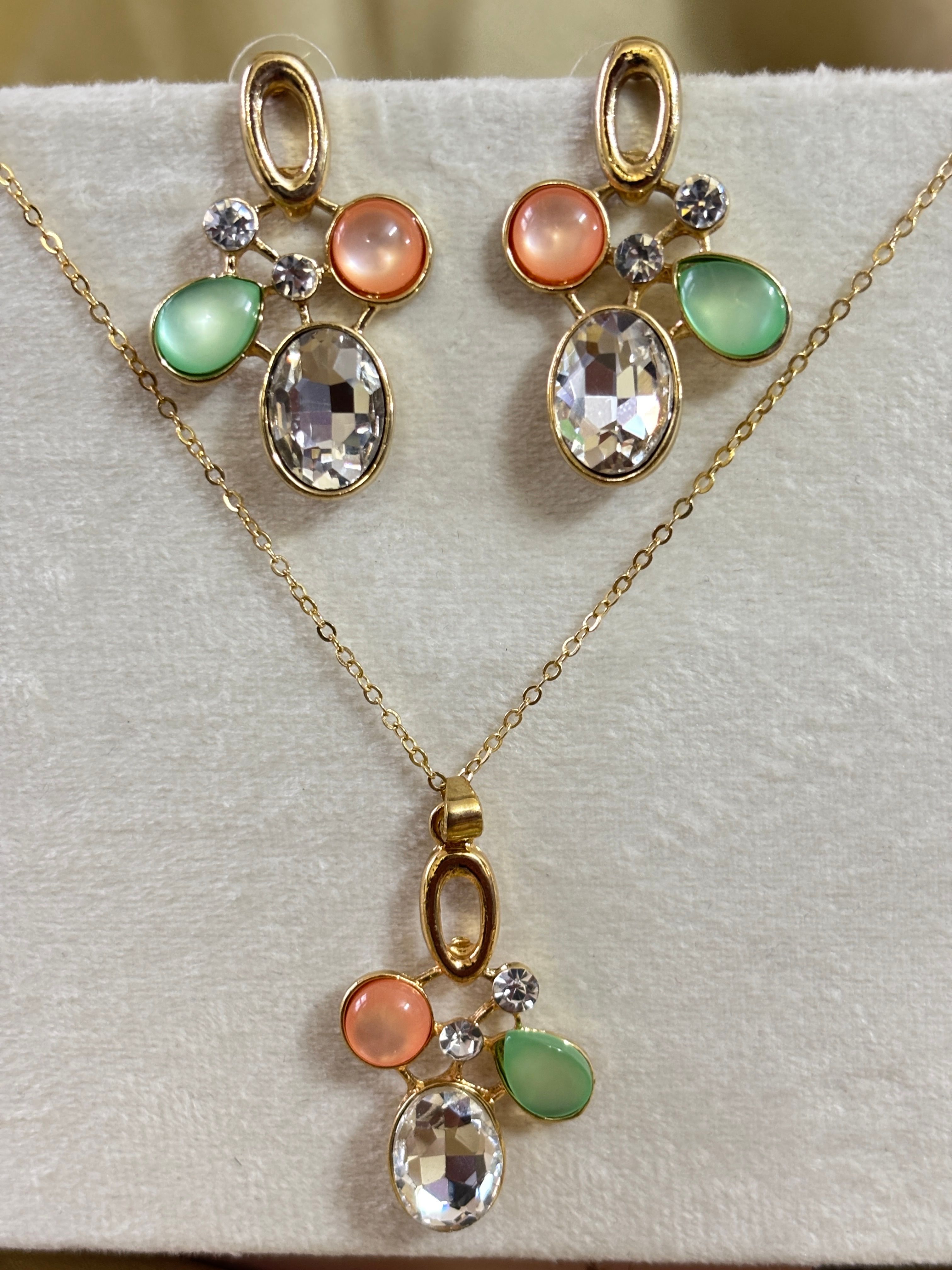 The Crystal Studded Enamel Set is a vibrant combo jewellery set featuring crystal-accented enamel pieces, available in Green & Orange and Pink & Orange colourways. Each set is handcrafted in India on a nickel-free zinc alloy base with a glossy enamel finish and sparkling crystal studs. An ideal gifting set and a bold choice for festive dressing, ethnic outfits, and everyday colour. Lightweight, skin-safe, and priced for accessibility.