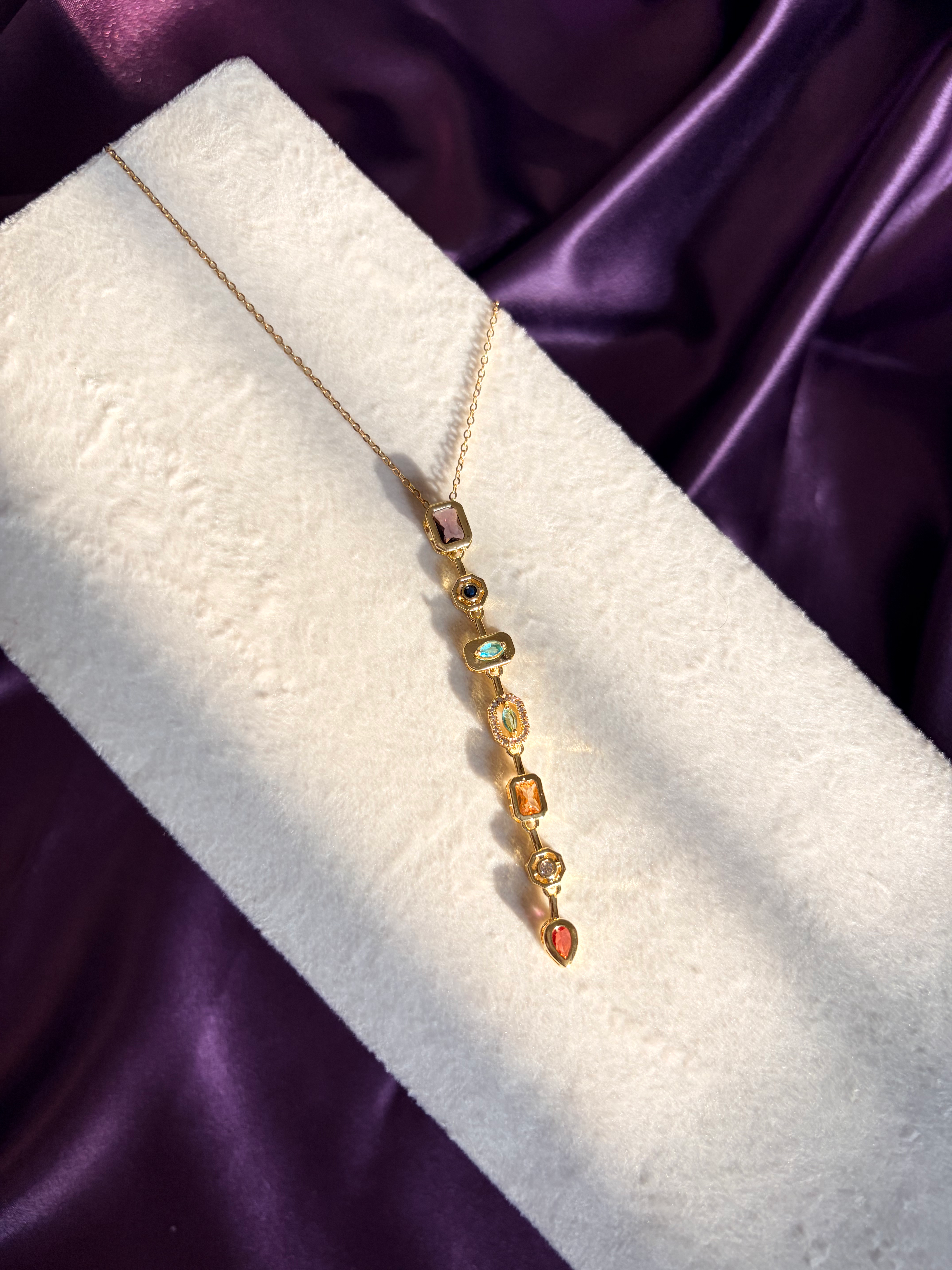 Let colour lead the way with this vibrant rainbow stone vertical bar Y necklace. Semi-precious stones in a spectrum of hues cascade gracefully, creating a playful yet refined accessory for every mood.