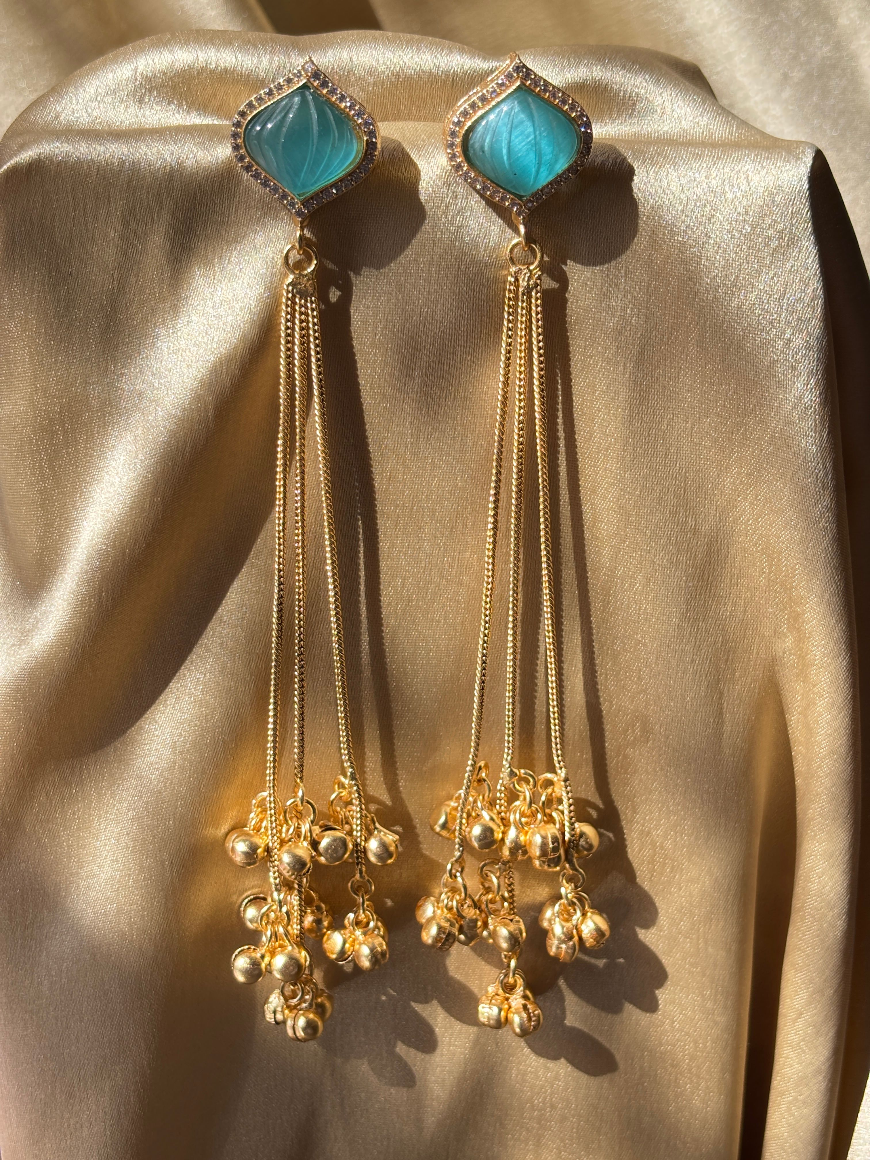 Make a statement with these stunning long tassel earrings featuring a carved amber-yellow resin stone centerpiece set in a gold-toned geometric frame embellished with delicate crystal detailing. Four sleek snake chains cascade elegantly from the stud, ending in a cluster of dainty gold ghungroo-style bells that catch the light with every movement.